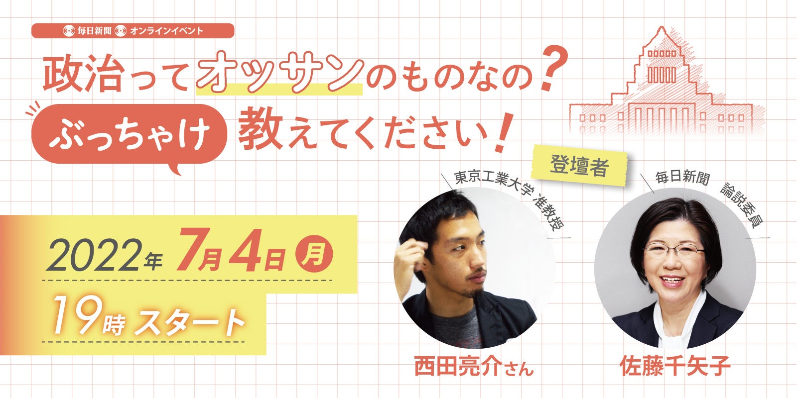 毎日新聞社(代表取締役社長執行役員:松木健)は7月4日(月)19時から、オンラインイベント『政治ってオッサンのものなの?ぶっちゃけ、教えてください!』を開催します。