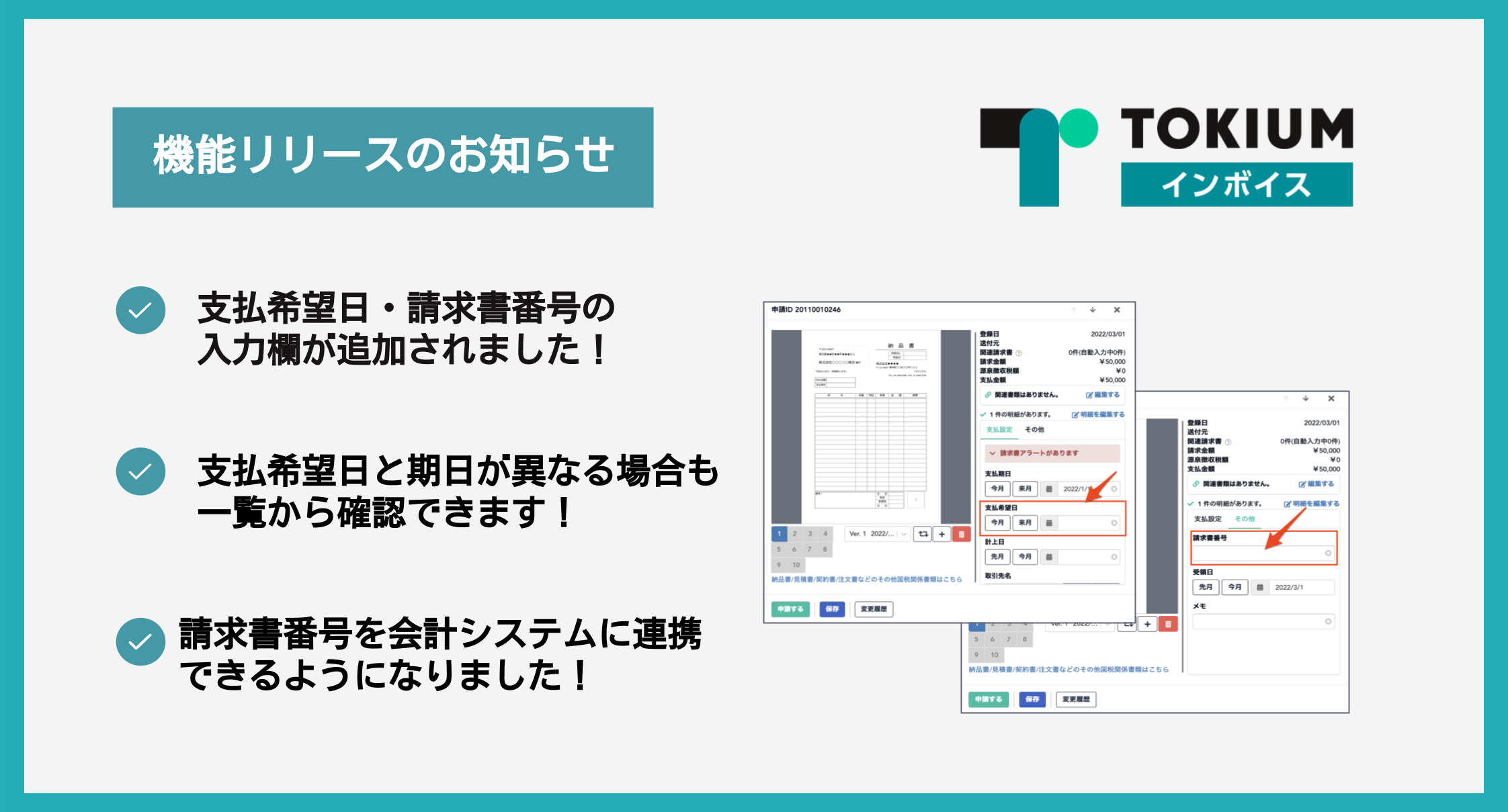 株式会社TOKIUM(本社:東京都千代⽥区、代表取締役:黒﨑賢一、以下「当社」)は、同社が提供する請求書受領クラウド【TOKIUMインボイス】の新機能として、「請求書番号」と「支払い希望日」の入力欄を追加しましたので、お知らせいたします。