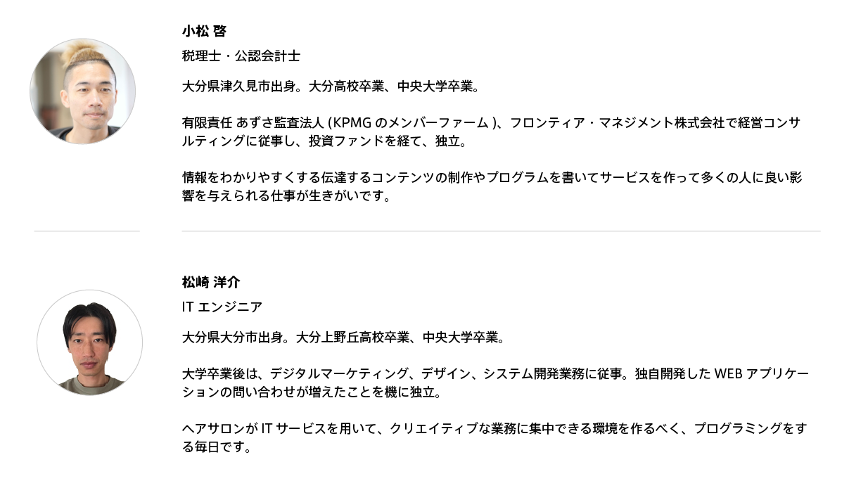 SNS(インスタ)集客に成功されており、いつでも独立開業できるぞという状況にいて、独立開業後も施術業務に集中したいというトップスタイリストの方向けに独立前の創業支援から独立後のIT周りの支援と数字周りの支援をマルっと私共は行います。創業(融資)支援から複数店舗展開支援、出口戦略に至るまで中長期的な視点で、ヘアサロンオーナー様の課題を解決します。他の税理士事務所や他のアプリ会社とは異なり、一気通貫で美容室・ヘアサロン様のIT周り&数字周りのご支援させて頂きます。