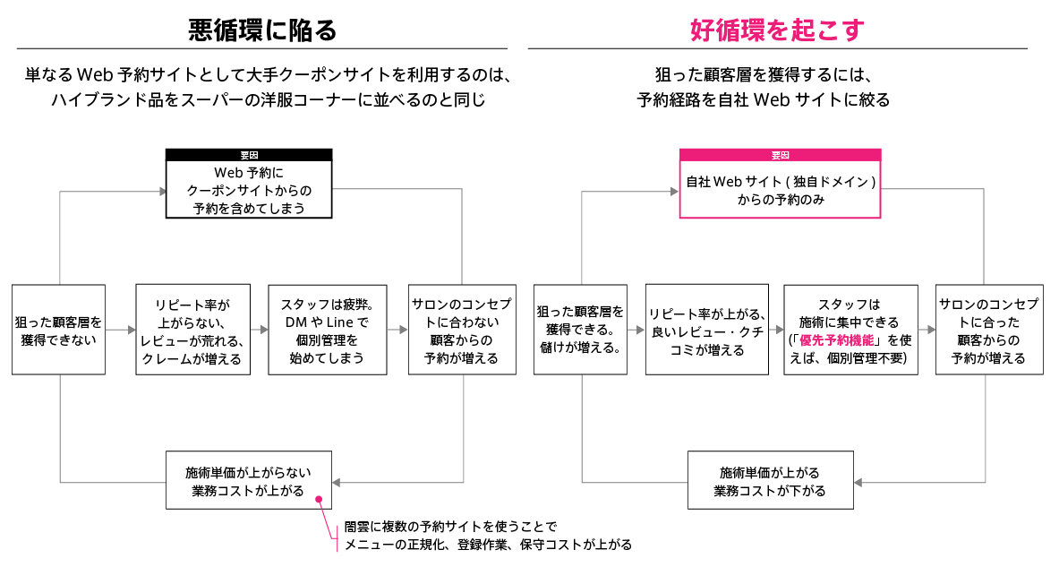 クーポンサイトではなく、自社のWebにWeb予約を設置すれば(加えて、自社のWebやインスタグラムなどで継続して「スタイル」を発信すれば)、提供したいサービスと顧客層がマッチして、