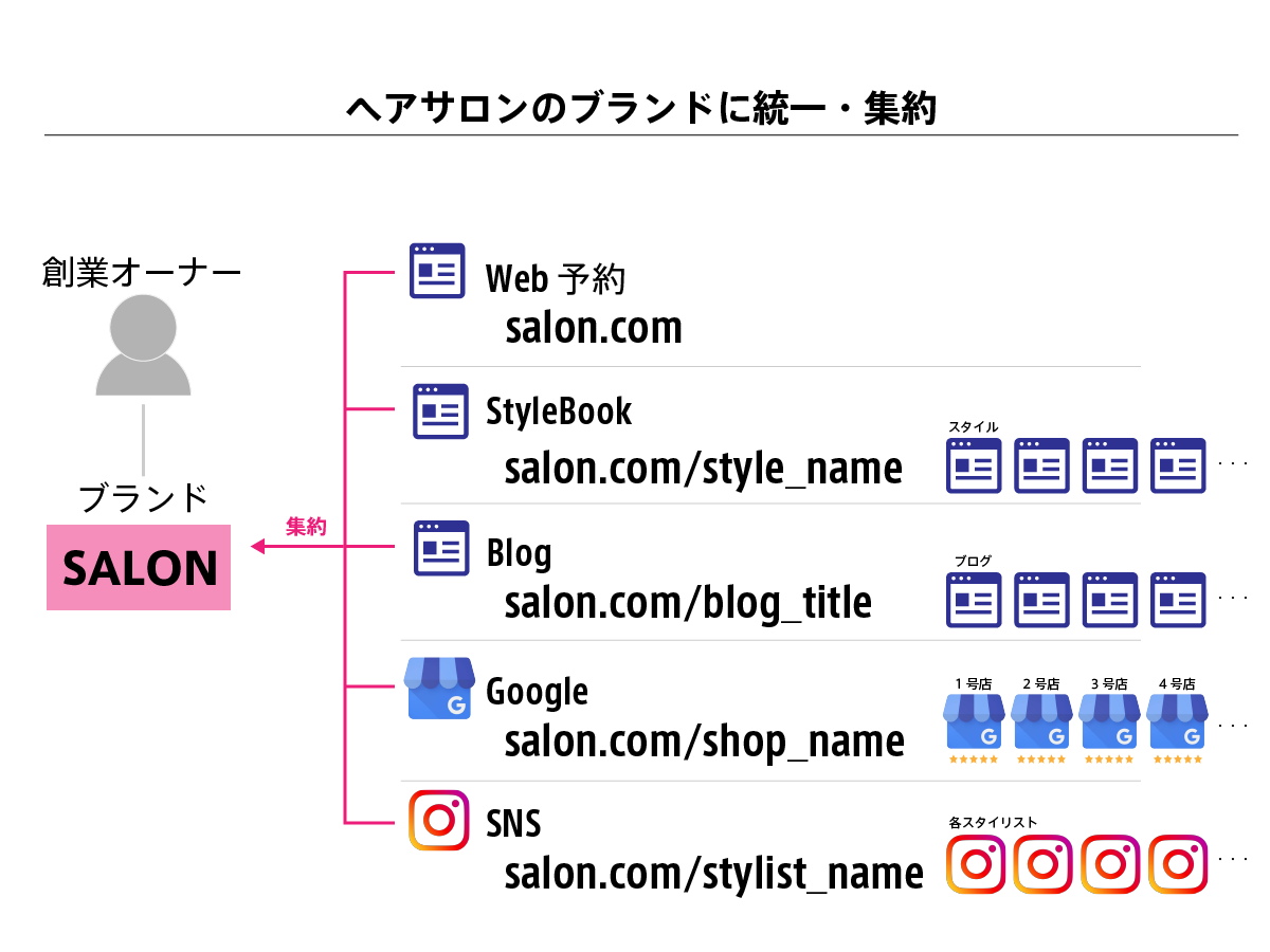 大手クーポンサイトやポータルサイト、他のPOS会社の予約サービスでは、その会社のドメイン下にお店IDなどがきます。そのため、インスタグラムの外部URL、Googleビジネス プロフィール(旧称:Google マイビジネス)の予約URLなどに予約サービスのドメインを表示しなければなりません。これではサロンのブランドを認知させる機会を自ら手放しているようなものであり、Web上の顧客体験も損なわれています。