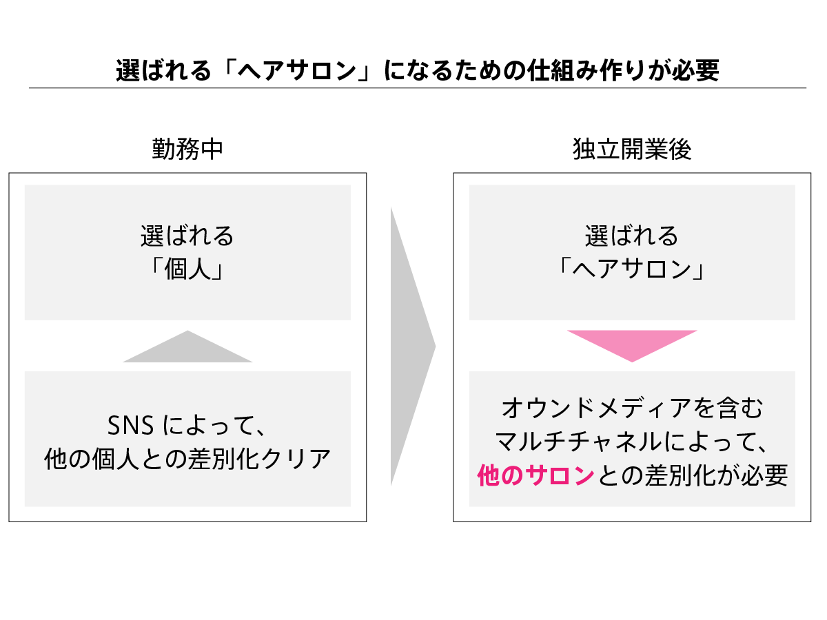 - 独立開業後、ヘアサロンを成長させるためには、選ばれる「個人」から選ばれる「へアサロン」になることが必要