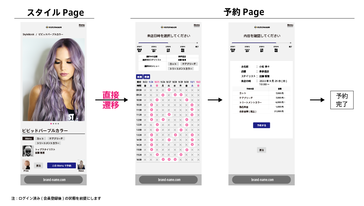予約時の遷移の少なさ、スタイルから直接予約に進めます。クーポンサイトや他の予約サービスと比べて心地よい体験をお客様に提供できます。