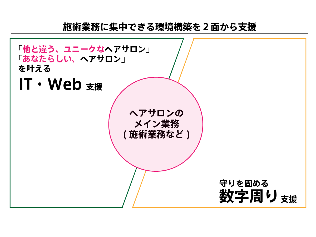 加えて、施術業務や従業員採用・育成といったヘアサロンの本業に注力するための経営環境の構築をIT面・数字面の両面から支援します。