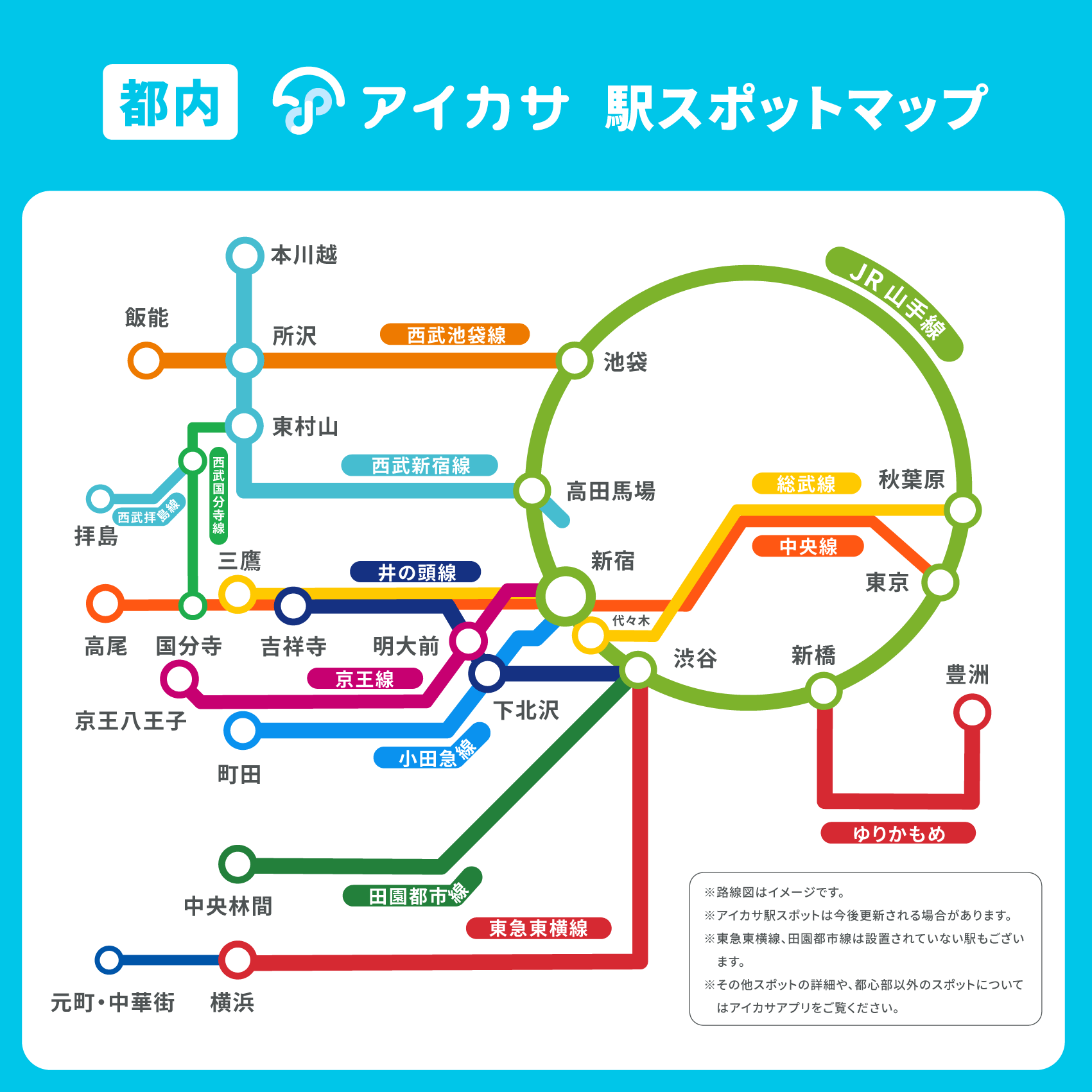 池袋駅、代々木駅、原宿駅、渋谷駅、目黒駅、新宿駅、東京駅、上野駅、秋葉原駅、新橋駅、浜松町駅、田町駅、飯田橋駅、虎ノ門ヒルズ駅、神谷町駅、恵比寿駅、品川駅など。