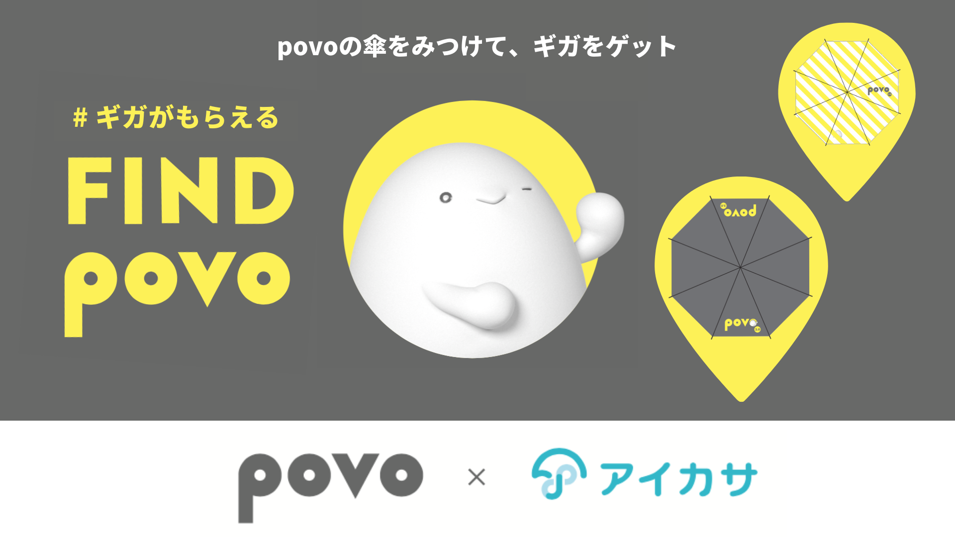 街中にあるpovoオリジナルデザインのアイテムやpovoキャラクターを探すと、povo2.0のギガがもらえるキャンペーンです。