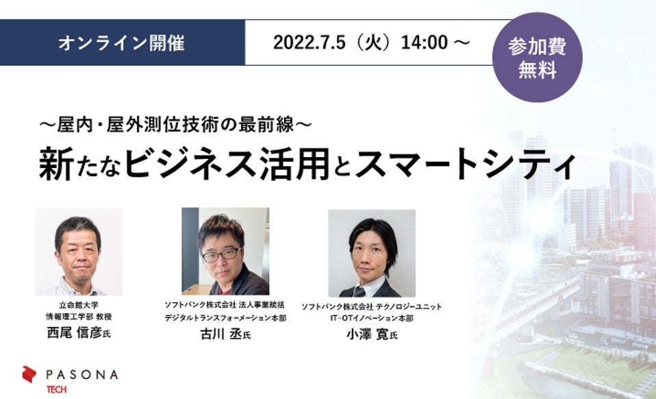 本ウェビナーでは、立命館大学 情報理工学部 教授 西尾信彦氏をお招きし、日本のスマートシティ化及びビジネスにおける位置情報の新たな活用について講演いただくほか、ソフトバンク株式会社 古川 丞氏、小澤 寛氏より、ソフトバンクの本社がある「東京ポートシティ竹芝」等で取り組む屋内測位技術の活用事例を紹介いただきます。