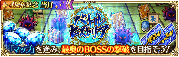 さまざまなイベントや新たな仲間と出会いながらマップを進み、最奥のボスを撃破する、全く新しいプレイ体験が楽しめるイベントです。プレイしてヒストリアポイント[期間限定]を集めると、ヒストリアポイント交換所で合計3,000ジュエルや一撃練武道場チケット-HP2360目安-[期間限定]などが獲得できます。