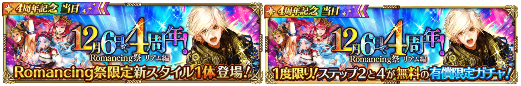 新ガチャ「12月6日で4周年!Romancing祭 リアム編」が開催中です。
