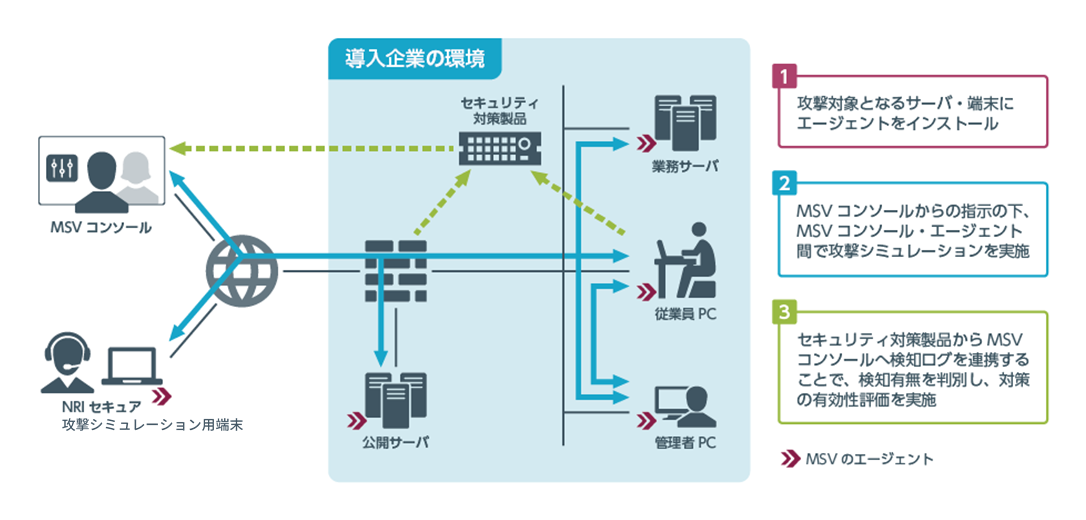 NRIセキュアは10年以上にわたり、「脅威ベースのペネトレーションテストサービス(TLPT[v])」を提供し、多くの企業に対して情報システムのセキュリティ運用を支援してきました。本サービスではその知見を活かし、MSVの導入・評価支援や、各社の状況や体制に合わせた対策の有効性評価の実行プランの提案を行います。最新の攻撃手法に詳しいNRIセキュアのコンサルタントが、実際の攻撃の戦術・技術・手順(TTP:Tactics, Techniques, and Procedures)を用いて、サイバー攻撃に対する各社のシステムの耐性評価を支援します。