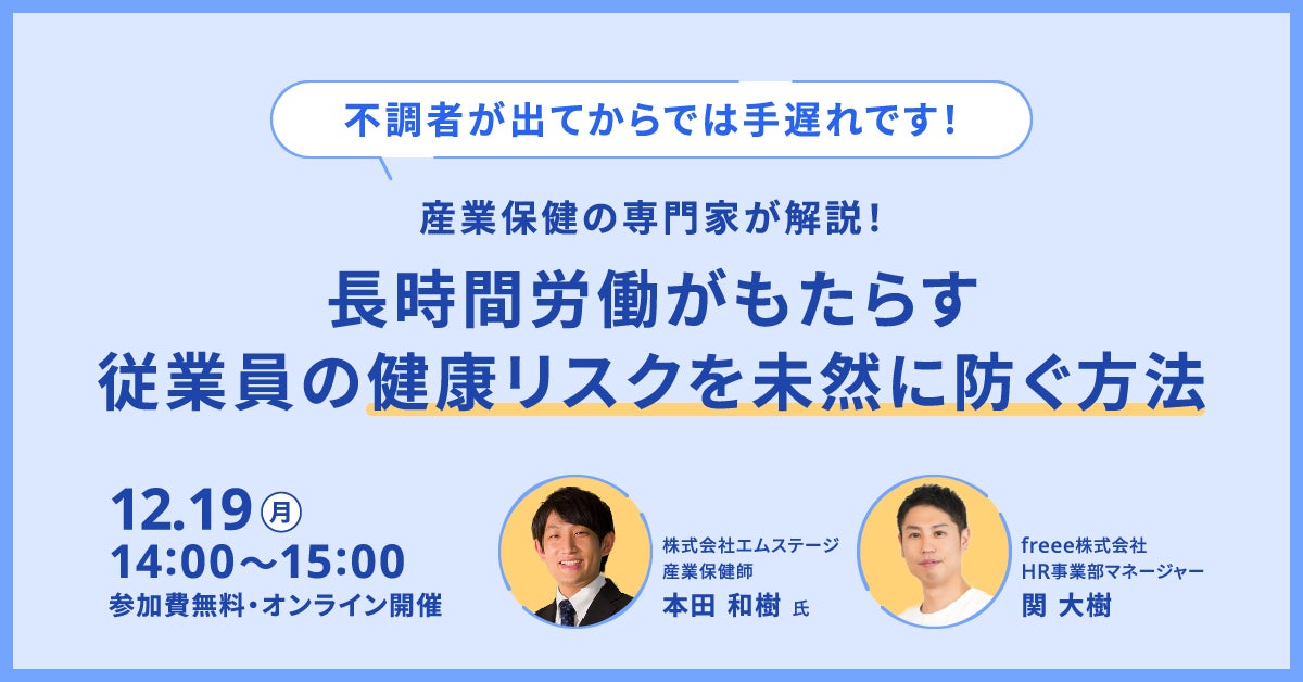freee株式会社(本社:東京都品川区、CEO:佐々木大輔、以下「freee」)が提供する「freee勤怠管理Plus」では、2022年12月19日(月)14時から、産業保健の専門家が解説するオンラインセミナー 「長時間労働がもたらす従業員の健康リスクを未然に防ぐ方法」を開催します。本セミナーでは、産業医・保健師サービスを中心に1,200社以上の企業の産業保健活動をサポートしている株式会社エムステージで産業保健師として活動する本田 和樹 氏が、勤務時間管理と健康管理の関連性や重要性について具体的なデータや事例を交えてお話しします。