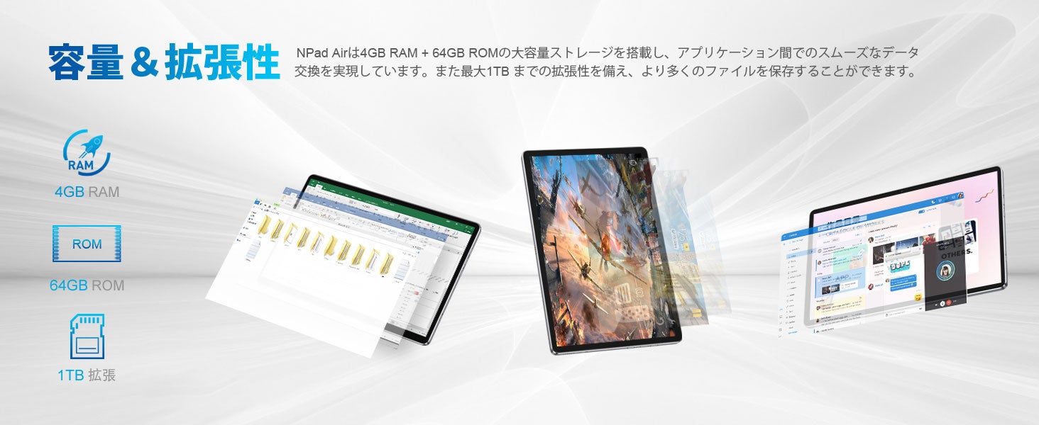 「NPad Air」は、8.5mmという驚異的な小型ボディで、重量はわずか520g。高質感あるメタルボディデザインにより、耐久性と携帯性を備えます。