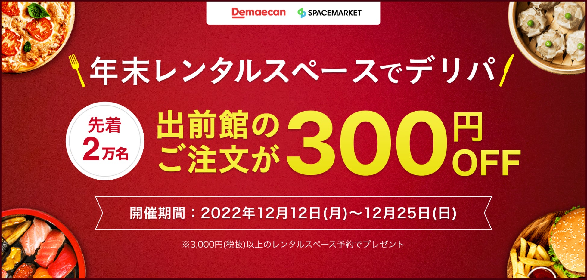 あらゆるスペースを貸し借りできるプラットフォーム「スペースマーケット」を運営する株式会社スペースマーケット(本社:東京都渋谷区、代表取締役社長:重松大輔、以下、スペースマーケット)は、株式会社出前館(本社:東京都渋谷区、代表取締役社長:藤井英雄、以下、出前館)が運営する日本最大級のデリバリーサービス「出前館」(と連携し、レンタルスペースの貸切空間で好きな食べ物を注文して楽しむフードデリバリーパーティー「デリパ」を提案します。これに伴い、2022年12月12日(月)より出前館で使えるクーポンを配布するキャンペーンを開始いたします。