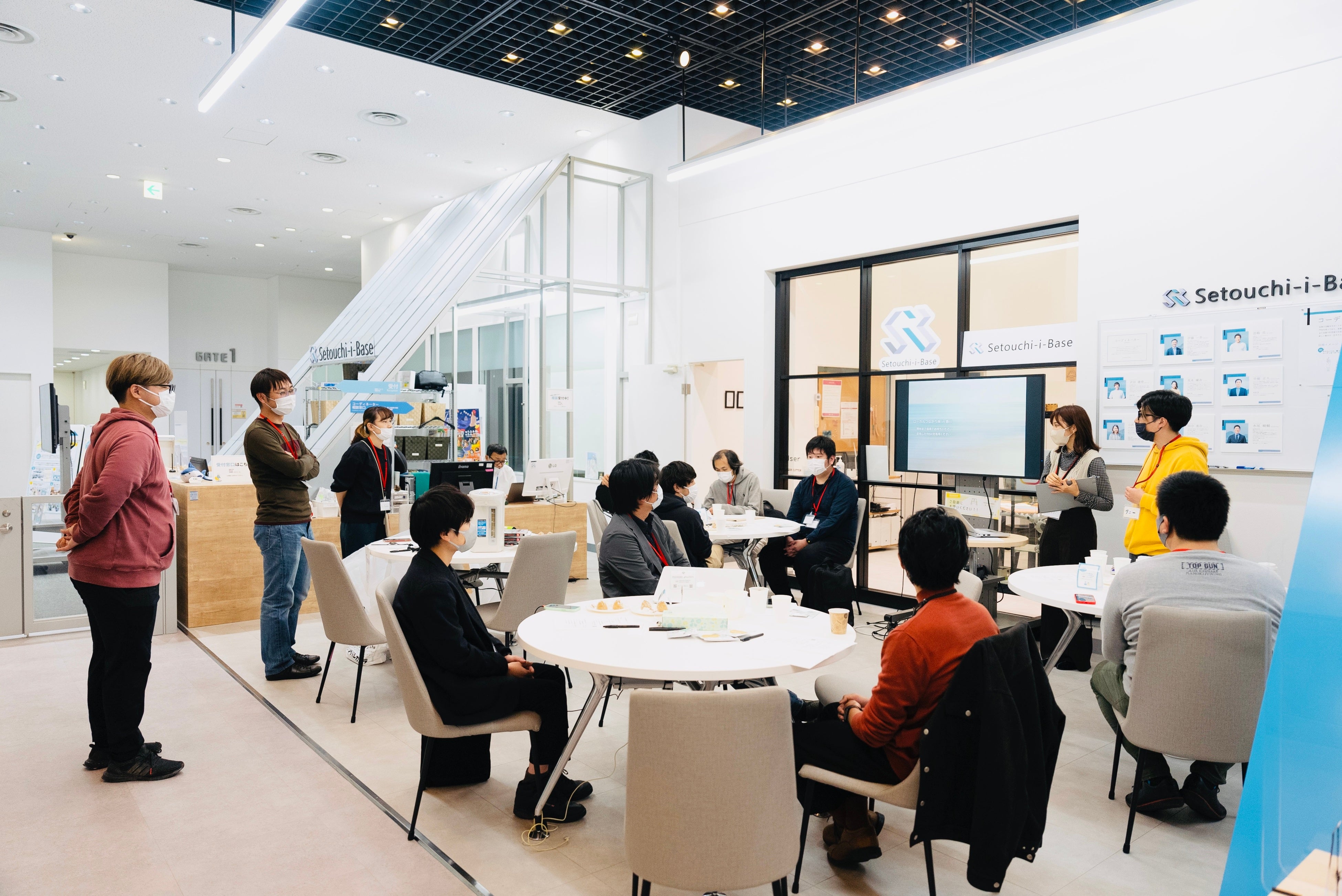 東京や大阪などの首都圏から本ツアーに参加いただき、チェックインを実施(コワーキング施設Setouchi-i-Base。香川発のスタートアップ企業の方々から企業説明をいただいたのち、感性ベース診断の結果に基づき、企業と参加者の交流会を行いました。