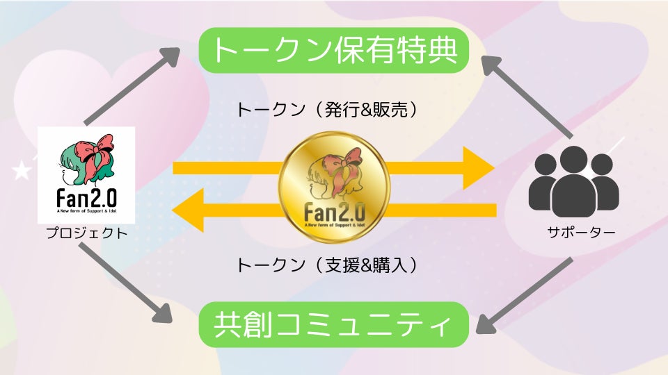 クリエイターは支援を募る目的でトークンを販売し、その収益を支援金として受け取ります。購入者は支援の証として購入額に応じた数量のトークンを受け取ります。トークンを持ち続ける(=保有する)ことで、支援を続けながら、コミュニティを通じて保有数に応じた投票権や抽選特典が受けられます。