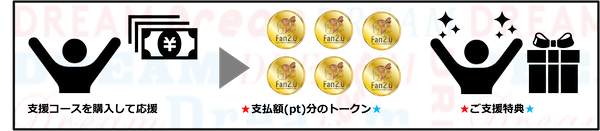 クリエイターは支援を募る目的でトークンを販売し、その収益を支援金として受け取ります。購入者は支援の証として購入額に応じた数量のトークンを受け取ります。トークンを持ち続ける(=保有する)ことで、支援を続けながら、コミュニティを通じて保有数に応じた投票権や抽選特典が受けられます。
