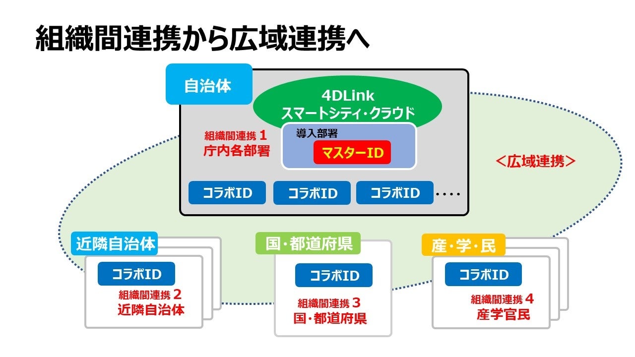 スマートシティ・クラウドは、庁内導入部署が持つマスタIDからコラボIDを発行することが可能です。コラボIDにより状況に応じた情報共有・作業連携が可能になります。庁内各部署だけでなく、近隣自治体、産学官民との連携もスムーズです。緊急を要する災害時、組織の垣根を超えた新たな取り組みに有効です。