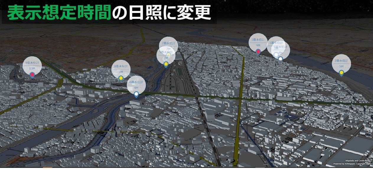 用途に合わせてベースマップを変更し、表示想定時間の日照を変更、日照・影などの景観シミュレーションができ、3D表現を最適化できます。