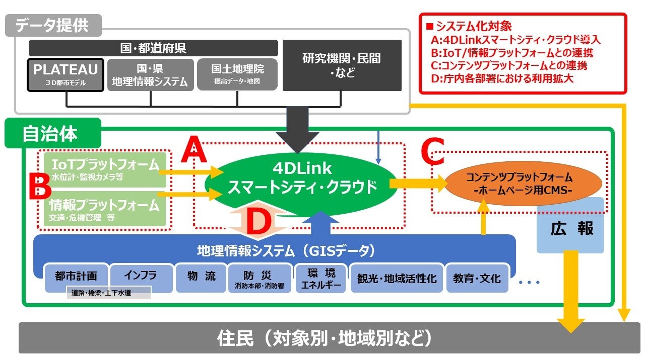 スマートシティ・クラウドの導入は、国・県が提供するデータ、各部署の地理情報システムのデータ、さらに水位計・監視カメラなどのIoTプラットフォーム、交通・危機管理情報プラットフォームとの連携により、地理情報とリアルデータの統合表示による情報環境整備、そして、シンプルな操作を提供するUIにより、ドラッグアンドドロップによるデータアップロード、URLコピーでベースマップ変更、HTMLへの埋め込みコードの発行などにより、庁内業務の内製化と自治体ポータルサイトからの住民向けサービスを推進します。