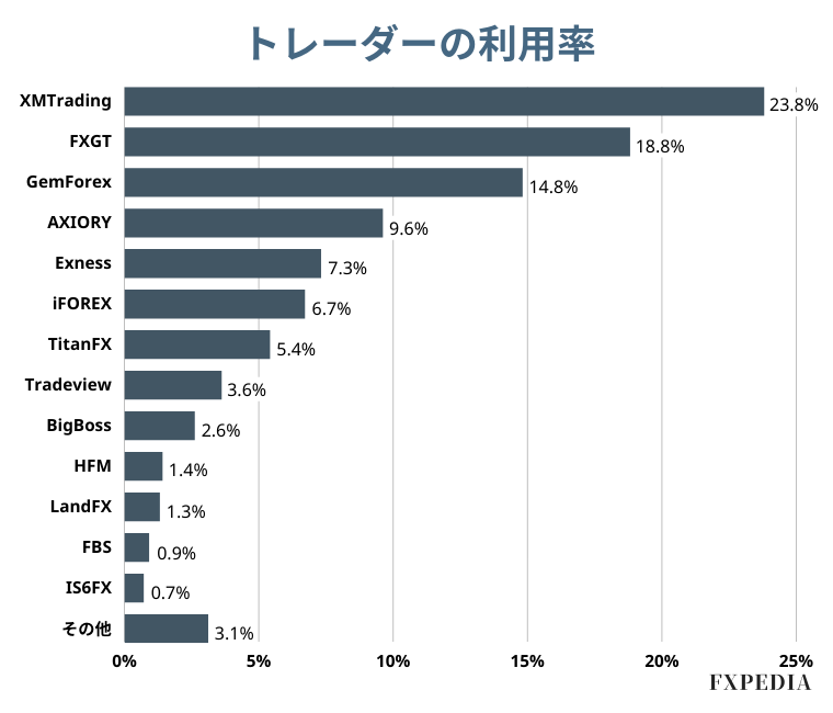 ●最も人気の高いFX取引業者は「XMTrading」で23.8%