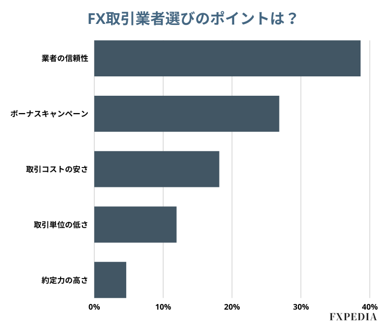「FX取引業者を選ぶ際に重要視する項目」で最も多かった回答は、「業者の信頼性」で38.6%、続いて「ボーナスキャンペーン」で26.8%、「取引コストの安さ 」で18.1%でした。