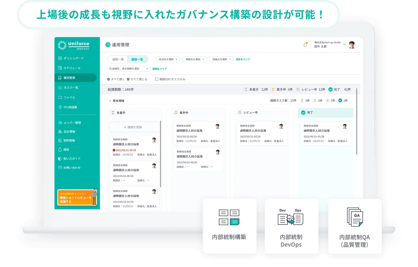 上場のためだけに構築した内部統制では、事業側の実務に沿った運用が行えずに、不祥事のリスクが高まることで上場廃止となるケースも見受けられます。Uniforceでは事業部側を巻き込んだプロジェクト体制を前提とした設計となっており、実態に伴ったカバナンスの構築をサポートします。