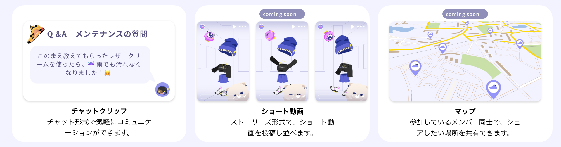 今後はストーリーズ形式で投稿できる「ショート動画機能」と、参加メンバー同士でシェアしたい場所が共有できる「マップ機能」の追加も予定しています。