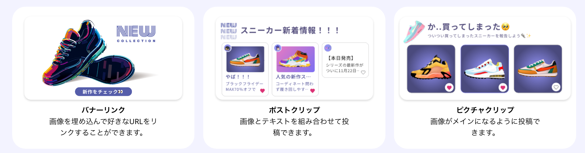 文字と画像、画像のみ、チャット、バナーの4つの機能と、テーマカラーやアイコン、背景を自由にカスタマイズして、オリジナルコミュニティページの作成が可能です。