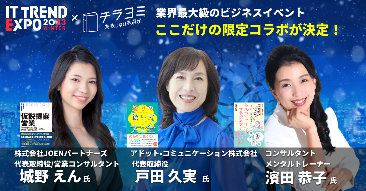 著者による書籍解説動画メディア「チラヨミ」との限定コラボとして、ビジネス本著者の城野 えん氏、戸田 久実氏、濱田 恭子氏の登壇が決定しましたことをお知らせします。