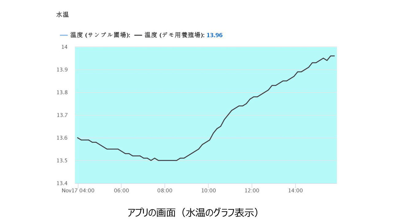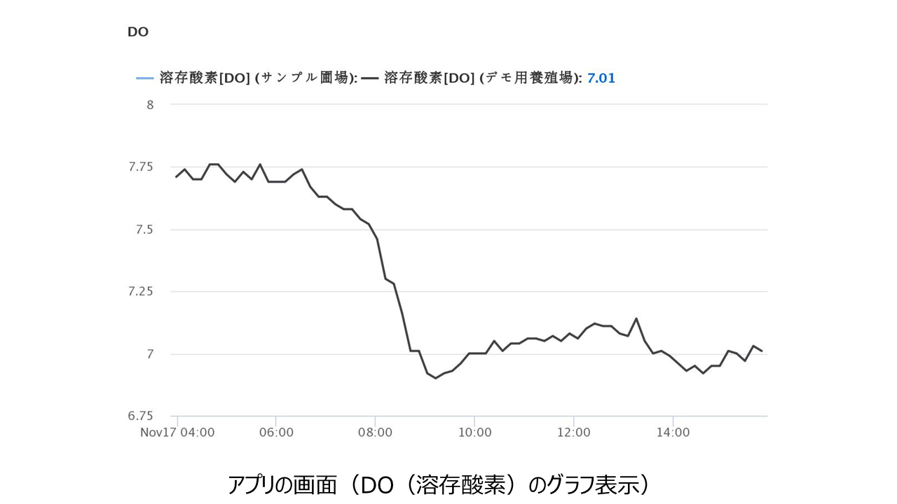 この「遠隔水質監視システム」により、チョウザメの生育にとって重要である水中のDO(溶存酸素)の値と、水温を遠隔からリアルタイムで監視できることにより、更なる効率改善と品質向上を目指しております。