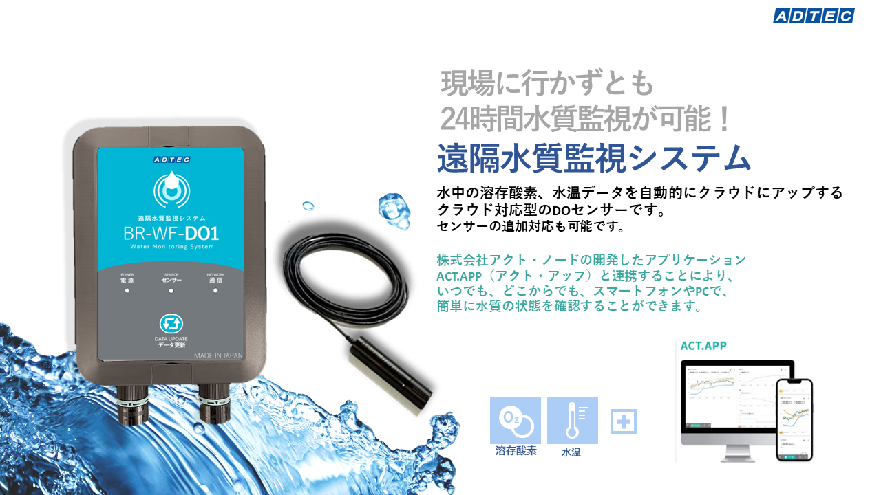 アドテックでは、養殖施設と言った一次産業分野でのIoTソリューションの提供を進めています。お客様のニーズに沿った様々なセンサをクラウド化する対応を進めてまいります。
