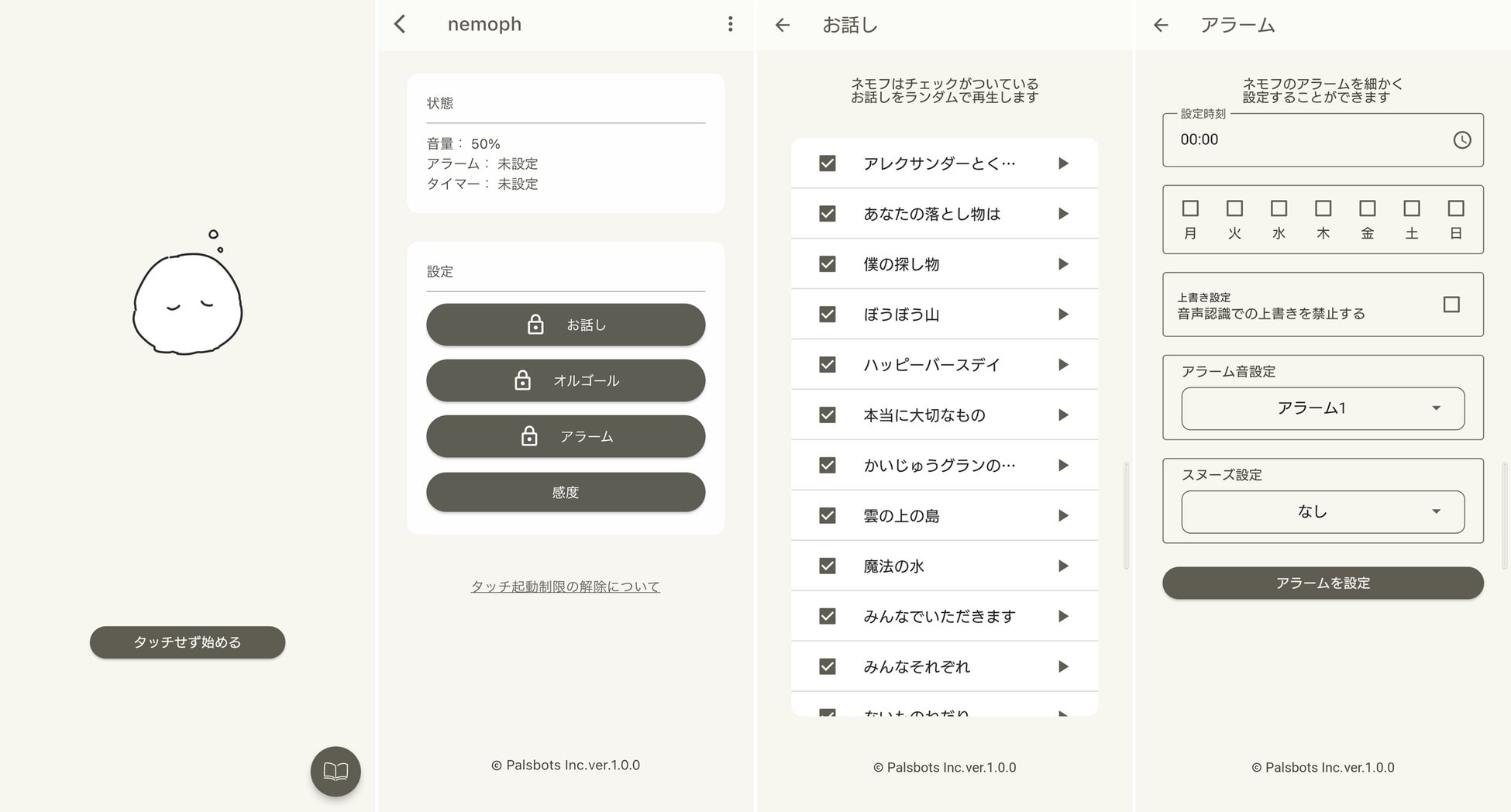 新バージョンのネモフはユーザー自身のスマートフォンに専用の“コアアプリ”をインストールして使用します。専用アプリはiPhone/Androidに対応しており、無料でダウンロードできます。NFC対応のスマートフォンなら従来品同等の機能は無料で使用できます。またNFC非対応のスマートフォンでもサブスクリプションに登録することで、NFCを使用せず機能を使うことができるようになります。また新バージョンのオリジナル要素として、お話しやオルゴールの再生対象が選べたり、アラームの手動設定ができるようになる有料の設定拡張機能が用意されています。