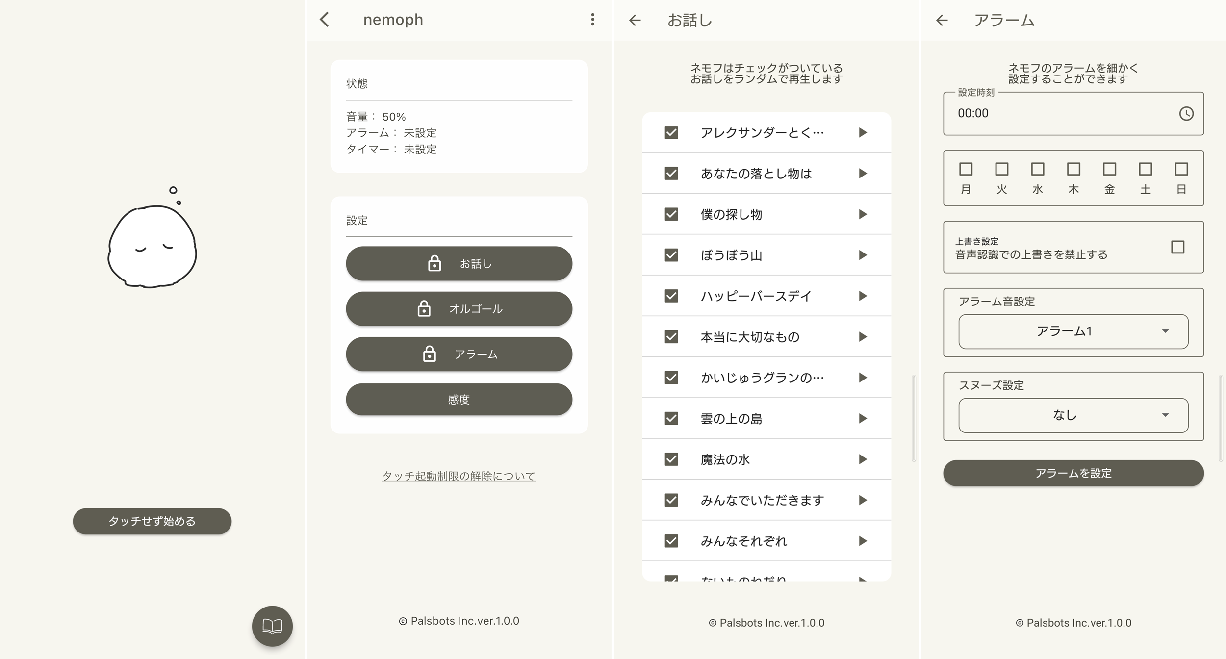 新バージョンのネモフはユーザー自身のスマートフォンに専用の“コアアプリ”をインストールして使用します。専用アプリはiPhone/Androidに対応しており、無料でダウンロードできます。NFC対応のスマートフォンなら従来品同等の機能は無料で使用できます。またNFC非対応のスマートフォンでもサブスクリプションに登録することで、NFCを使用せず機能を使うことができるようになります。また新バージョンのオリジナル要素として、お話しやオルゴールの再生対象が選べたり、アラームの手動設定ができるようになる有料の設定拡張機能が用意されています。