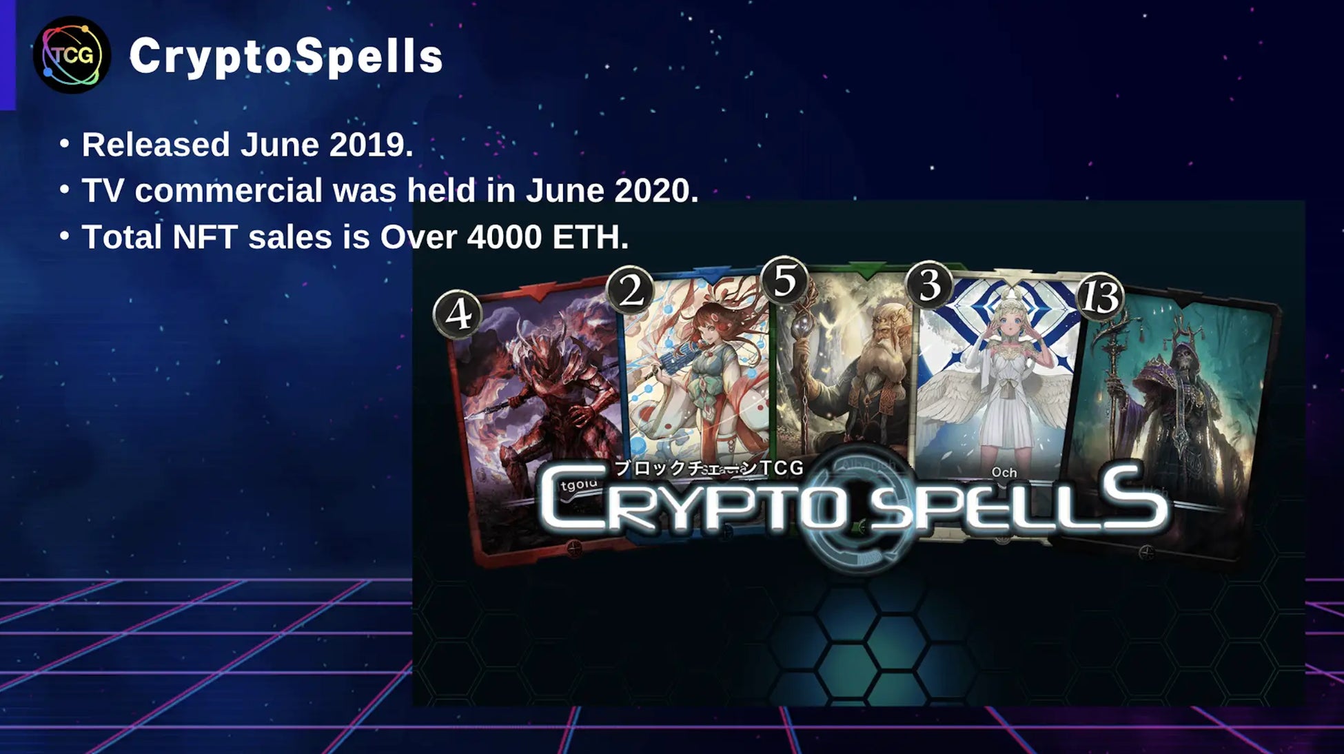 NFTサービスの開発を⾏うCryptoGames社は、ウォレット・イーサリアムなしで遊べるブロックチェーンゲーム『クリプトスペルズ』を2019年6月25日に正式リリースしています。クラウドセールの売上は900ETHを突破し、当時日本最高記録となりました。2020年6月には初の地上波テレビCMも実施しました。