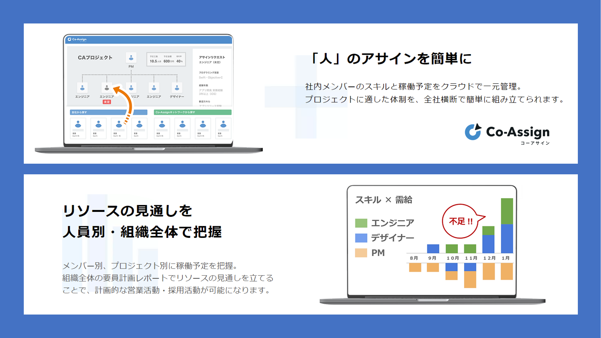 社内外人員のスキルと稼働予定の管理、プロジェクトの要員計画やアサイン調整、人材調達の機能をオールインワンで提供する「Co-Assign」は、そんな開発会社様の課題を解決する人材リソース最適化プラットフォームです。アサイン調整を行うマネージャーが社内のエンジニアやデザイナー等の稼働状況をひと目で確認でき、適切なプロジェクトへボタン一つでアサインできるだけでなく、利用企業と外部協力企業が共同利用することで、外部協力企業から速やかに人員を調達し、人材リソース不足も解消できます。社内外人材の稼働予定とプロジェクト要員計画の全体像を一元化・見える化し、人材リソースの長期的な見通しを立てることで、部署間・プロジェクト間のアサイン調整が容易になり受注キャパシティも向上。プロジェクト体制を組み立てられず案件をお断りする、機会ロスの低減も期待できます。