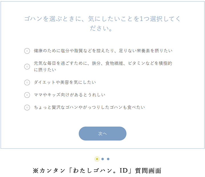 サイト内に設置された診断機能(「わたしゴハン。ID」)を利用することで、お客様が求めるメニューが表示されます。