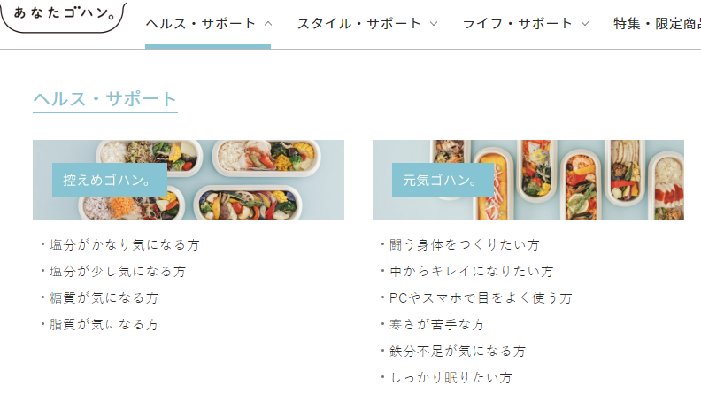 その他にも、健康に気を遣う方向けのメニューが表示される「ヘルス・サポート」や、美容に気を遣う方向けのメニューが表示される「スタイル・サポート」、しっかり食べたい方向けのメニューが表示される「ライフ・サポート」など、お客様のライフスタイルに合わせてメニューを選べるサポートカテゴリも用意されており、様々な角度からお客様が必要とするメニューにたどり着くことができる導線設計となっています。