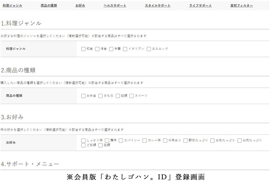 会員登録後に利用できる詳細な「わたしゴハン。ID」ではより細かな項目を設定可能な他、「わたしゴハン。ID」と同じ機能を持つ「家族ゴハン。ID」も利用できるようになり、家族を含めた食の好みやアレルギー情報を会員専用マイページで管理できるようになります。