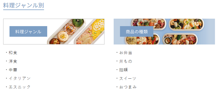 お客様の求めるメニューがすぐ探し出せるよう、和食、洋食、中華など、計10種類の料理ジャンルでカテゴリ分けされており、食べたいゴハンを迷わず探し出すことができます。