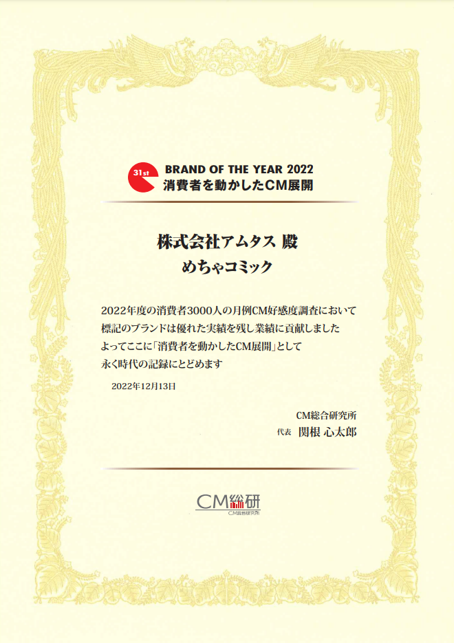 この度、「めちゃコミック」のテレビCMが、CM総合研究所が発表する「BRAND OF THE YEAR 2022」において「消費者を動かしたCM展開」を受賞しました。「BRAND OF THE YEAR 2022」は、月例CM好感度調査にもとづき発表されるもので、CMオンエアした商品・サービス全6,833銘柄のうち151銘柄が受賞となりました。「めちゃ犬」でのCMを開始した当初の2014年度、2015年度と、有吉弘行さんに参加いただいた2021年度に続いて、4度目の受賞となります。