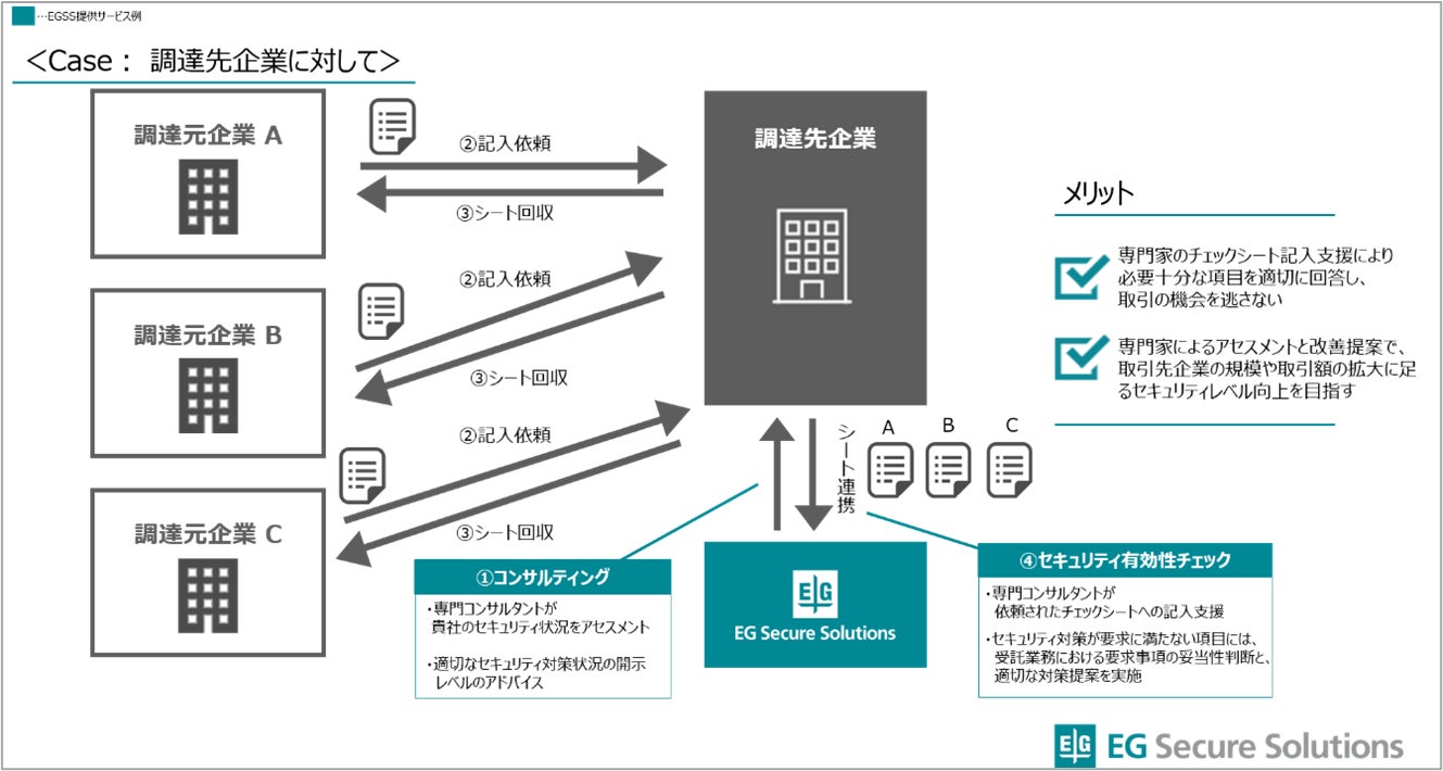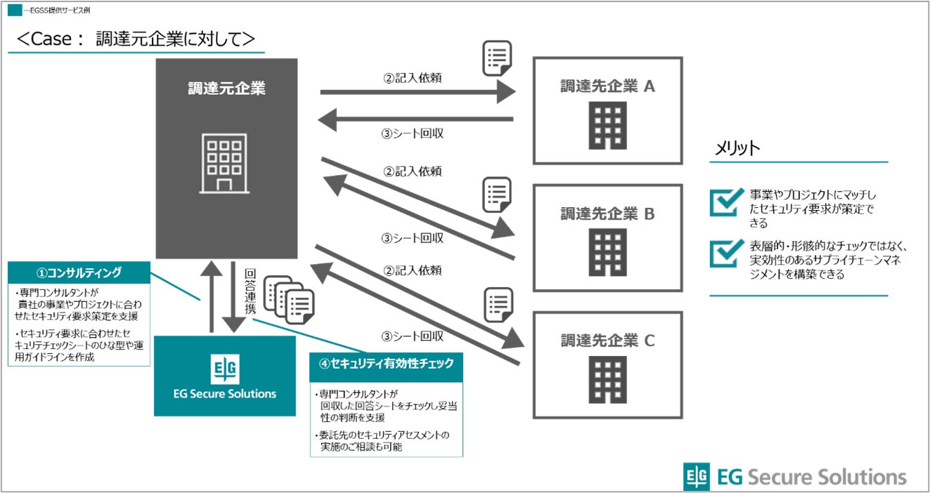 そこで、EGセキュアソリューションズは、これまでのコンサルティングの知見を活かしサプライチェーンにおける顕在的・潜在的なリスクを未然防止する対策として、サプライチェーンを構成する調達元/調達先双方の企業向けに「サプライチェーンマネジメント強化支援サービス」の提供を開始いたします。