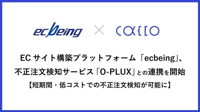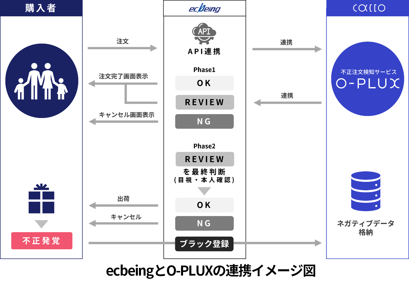 「ecbeing」と「O-PLUX」の機能連携を活用することで、クレジットカードの不正利用や悪質転売等について、シームレスな対策を短期間かつ低コストで導入することが可能となります。(詳細な導入費用に関してはお問い合わせください。)