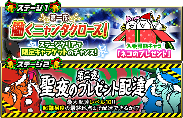 「第二夜 聖夜のプレゼント配達」はクリアする程強くなる敵が立ちはだかります。ステージレベルは最大10!この機会にクリスマス限定のステージをぜひお楽しみください。