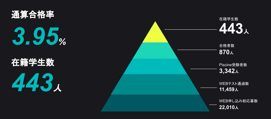 開校からの総応募数は22,010人。合格者は870人。Piscine突破率はわずか3.95%となりました。