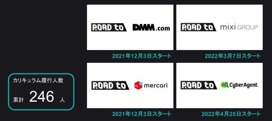 第1弾として、42 Tokyo の本カリキュラムに賛同いただいた、合同会社DMM .com、株式会社サイバーエージェント、株式会社ミクシィ、株式会社メルカリが、「Road to」カリキュラムに参画。このカリキュラムは246人が履行しています。