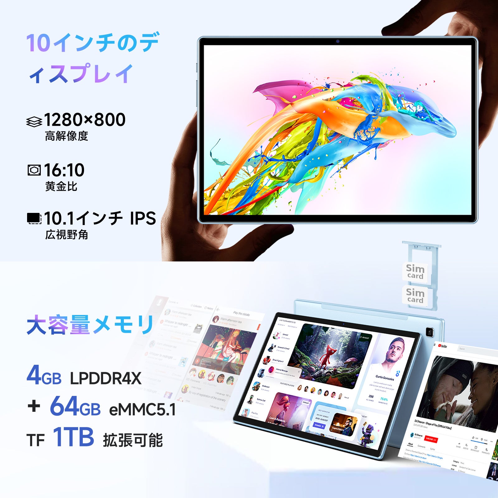 10.1インチのIPS広視野角ディスプレイを搭載し、1280×800のHD解像度により、複数の人が同時に動画を見ても素晴らしい視覚体験ができます。さらに16:10の黄金比の画面で、より快適な動画鑑賞体験が得られます。