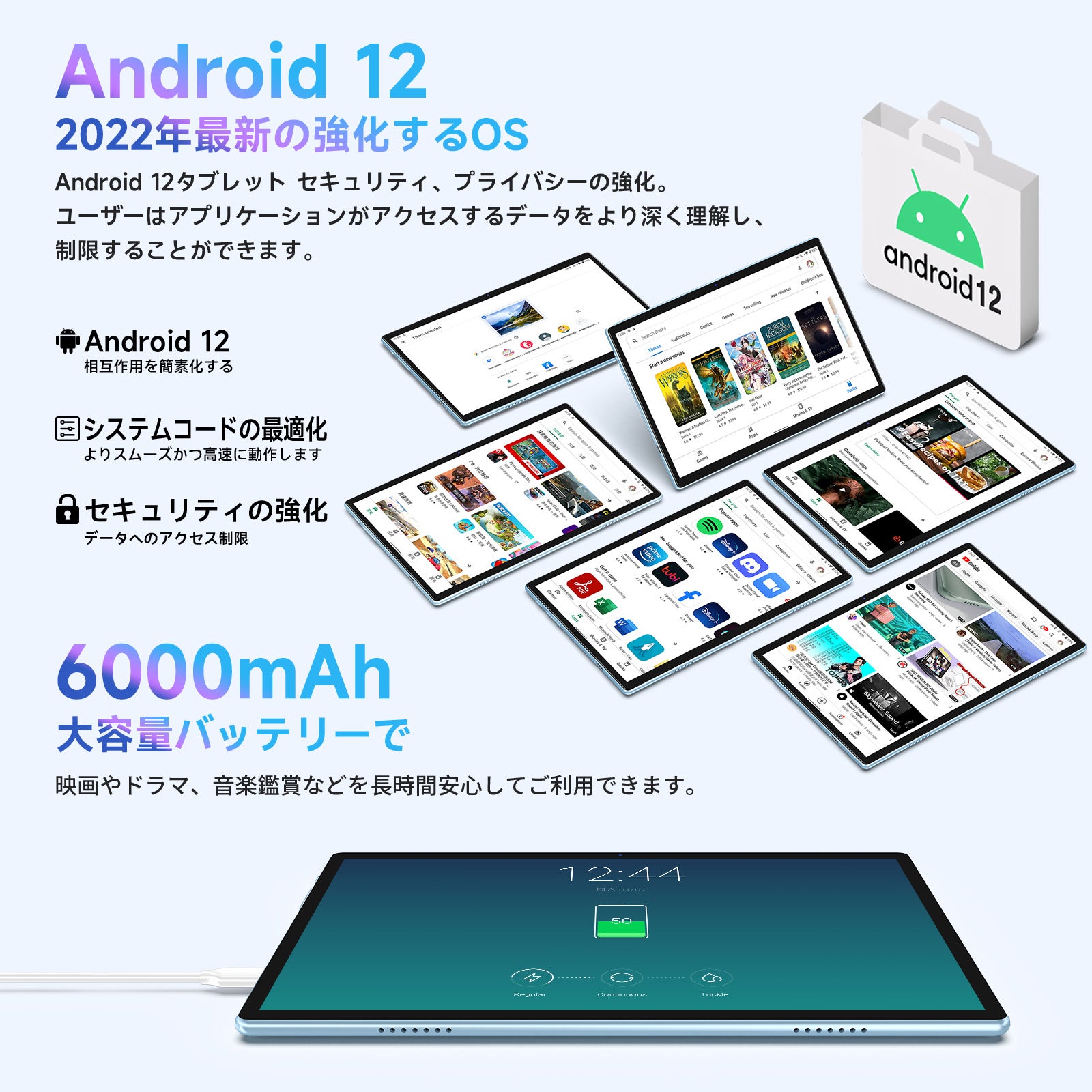 6000mAhの大容量のバッテリーとAIインテリジェント電源管理として、長時間の映画・読書・ブラウジングを楽しむことができます。