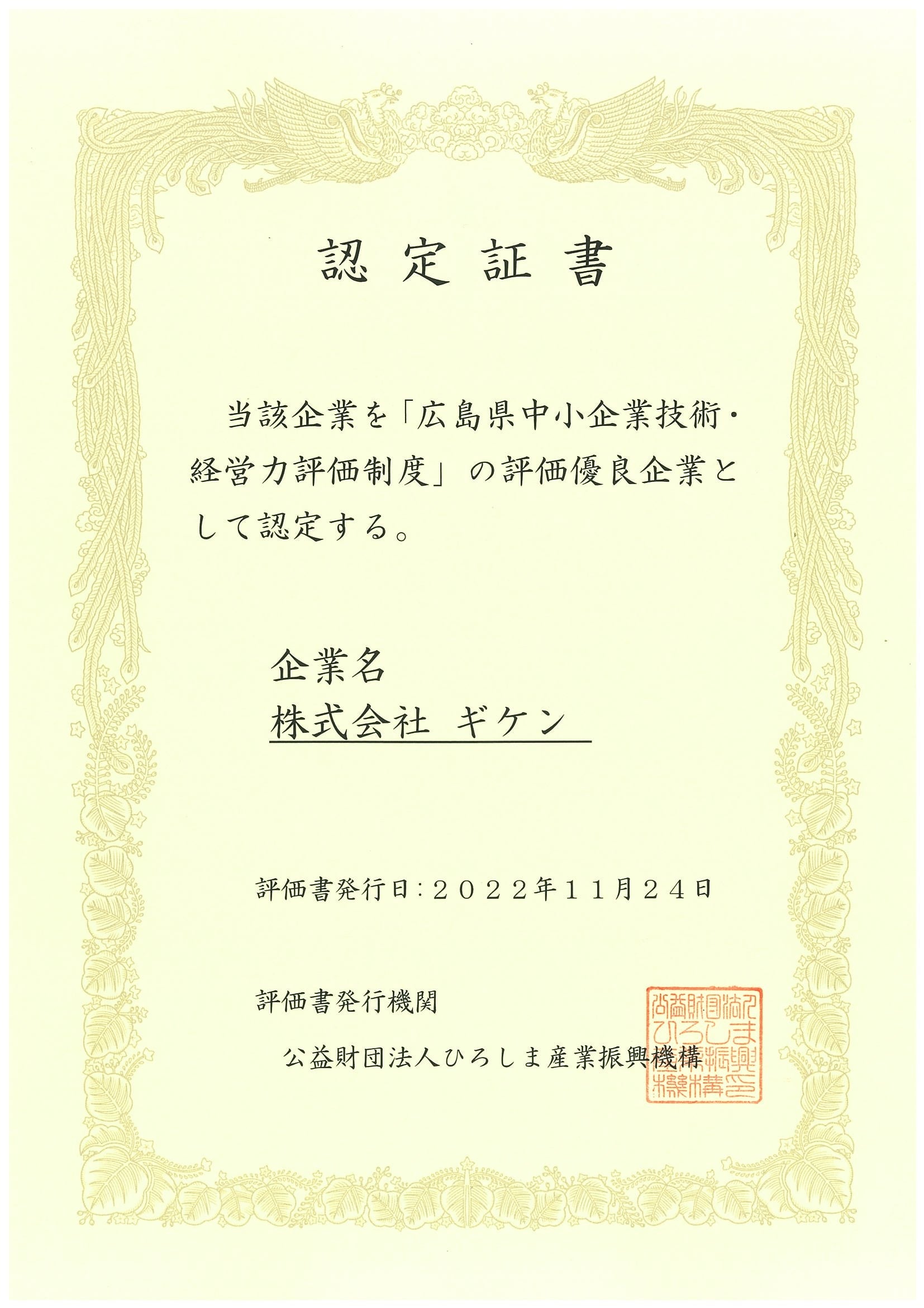 金型設計・製作、自動車部品製造、検査具・治具製作を行う株式会社ギケン(本社:広島県、代表者:森田 茂隆)は、公益財団法人ひろしま産業振興機構が運営する中小企業技術・経営力評価制度において、「評価優良企業」に認定されたことをお知らせします。