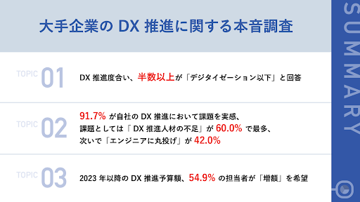 今回は、大企業(従業員数 1000 名 以上)の DX 推進担当者 109 名を対象に、大手企業の DX 推進に関する本音調査を実施しました。まず DX 推進度合いについて伺ったところ、約半数が「デジタライゼーション以下」の段階であることがわかりました。具体的な DX の施策としても「ペーパーレスの推奨」、「DX 人材の確保」であることから、未だに大手企業でも DX は初期段階であると言えるでしょう。また「DX をどう捉えているか」という設問に対して、「経費削減」や「業務効率化」などの答えが得られ、ビジネスモデルや事業を変革するものであると捉えている企業は多くはないという現状が伺えます。また、具体的な課題についての「本音」をヒアリングしたところ、「自社内の DX 推進人材が不足している」に続き、「エンジニアに丸投げになっている」という課題も多く挙がりました。また、その他の回答から「 DX の定義が曖昧」という声もあり、組織一丸となって 同じ目標やビジョンに向かって DX を推進できていない企業が少なからず存在することが推察されます。