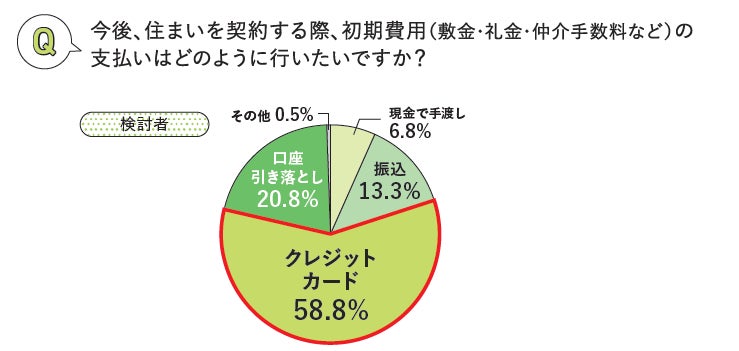検討者に初期費用の決済方法について聞いたところ、約6割がクレジットカードでの支払いを希望しました。初期費用は数万~数十万と高額なことも多いため、クレジットカード払いによるポイントを得たいというニーズもありそうです。